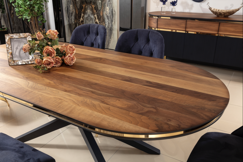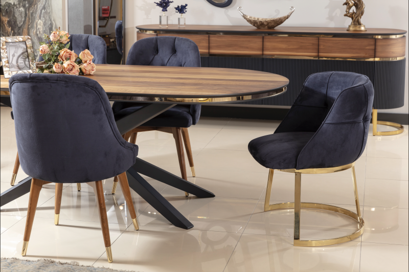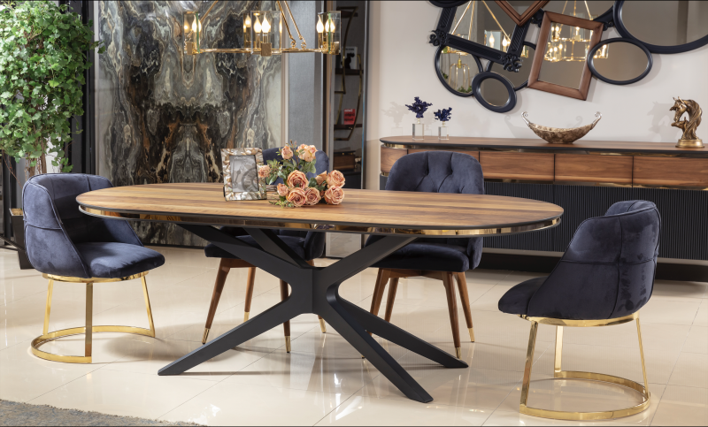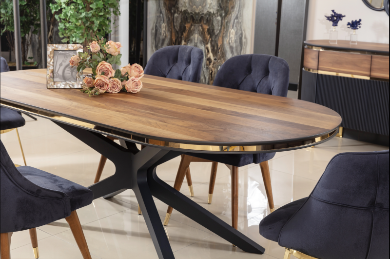 La mesa de comedor modelo Atlanta será el centro de atención en todas sus comidas. Hecha en Turquía y única en todo México. Con recubrimientos en metal de titanio y madera de haya. La mesa de comedor Atlanta además de denotar lujo y elegancia, es un ícono por su diseño curvo y su pedestal diferente a lo convencional.